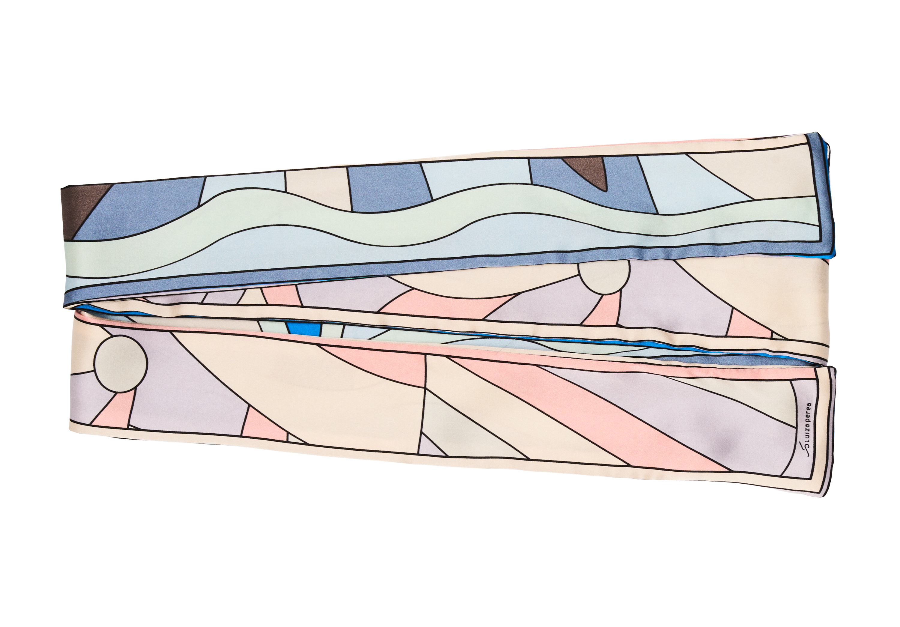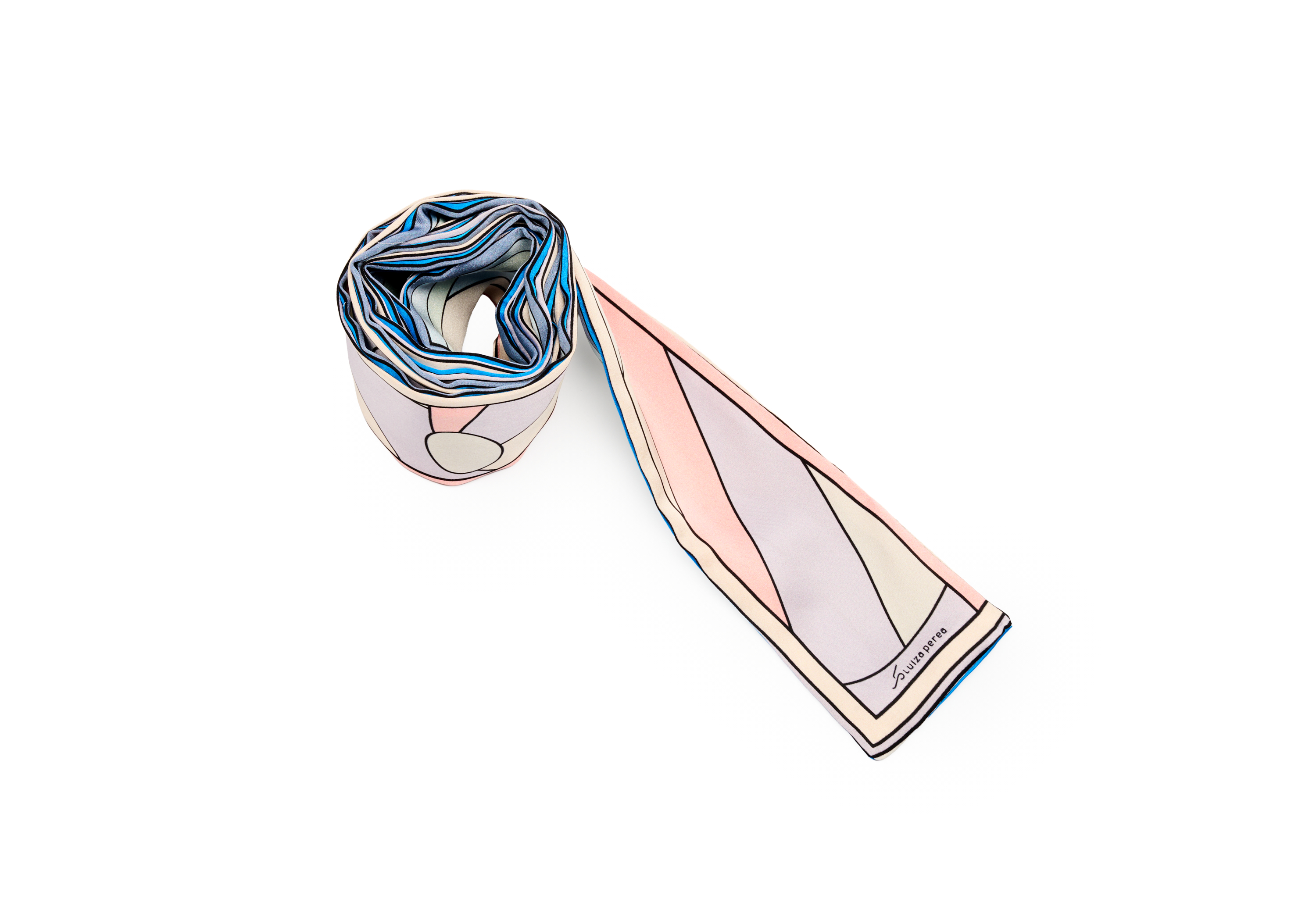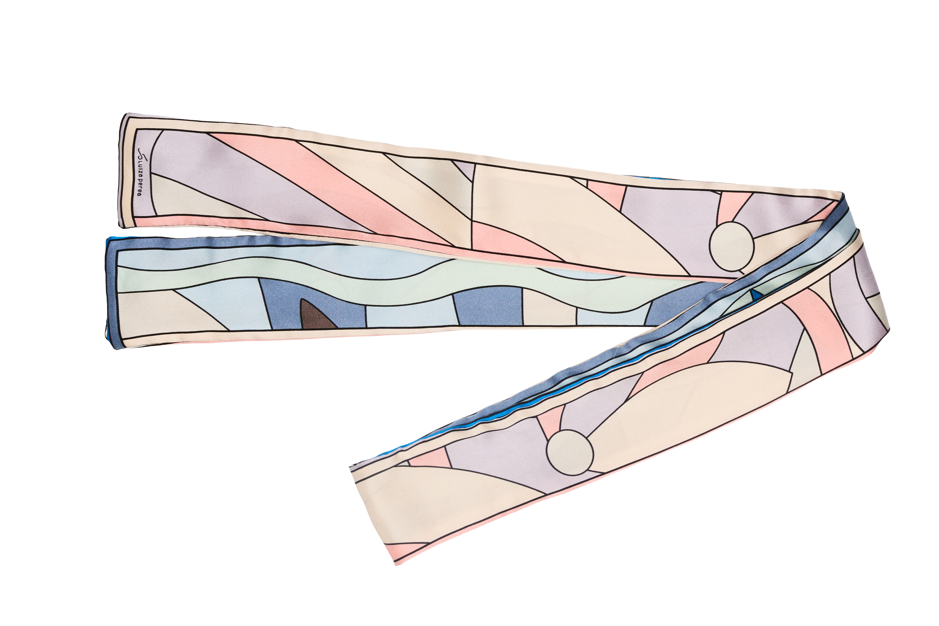 Faixa de seda acetinada — 162 × 6 cm de puro movimento. A estampa é exclusiva da casa Luiza Perea, produzida em impressão digital de alta definição. Duas faces estampadas, costuradas e unidas — frente e verso que se encontram em cada detalhe. Para amarrar no cabelo, envolver a bolsa, laçar no pescoço. Um detalhe que transforma.