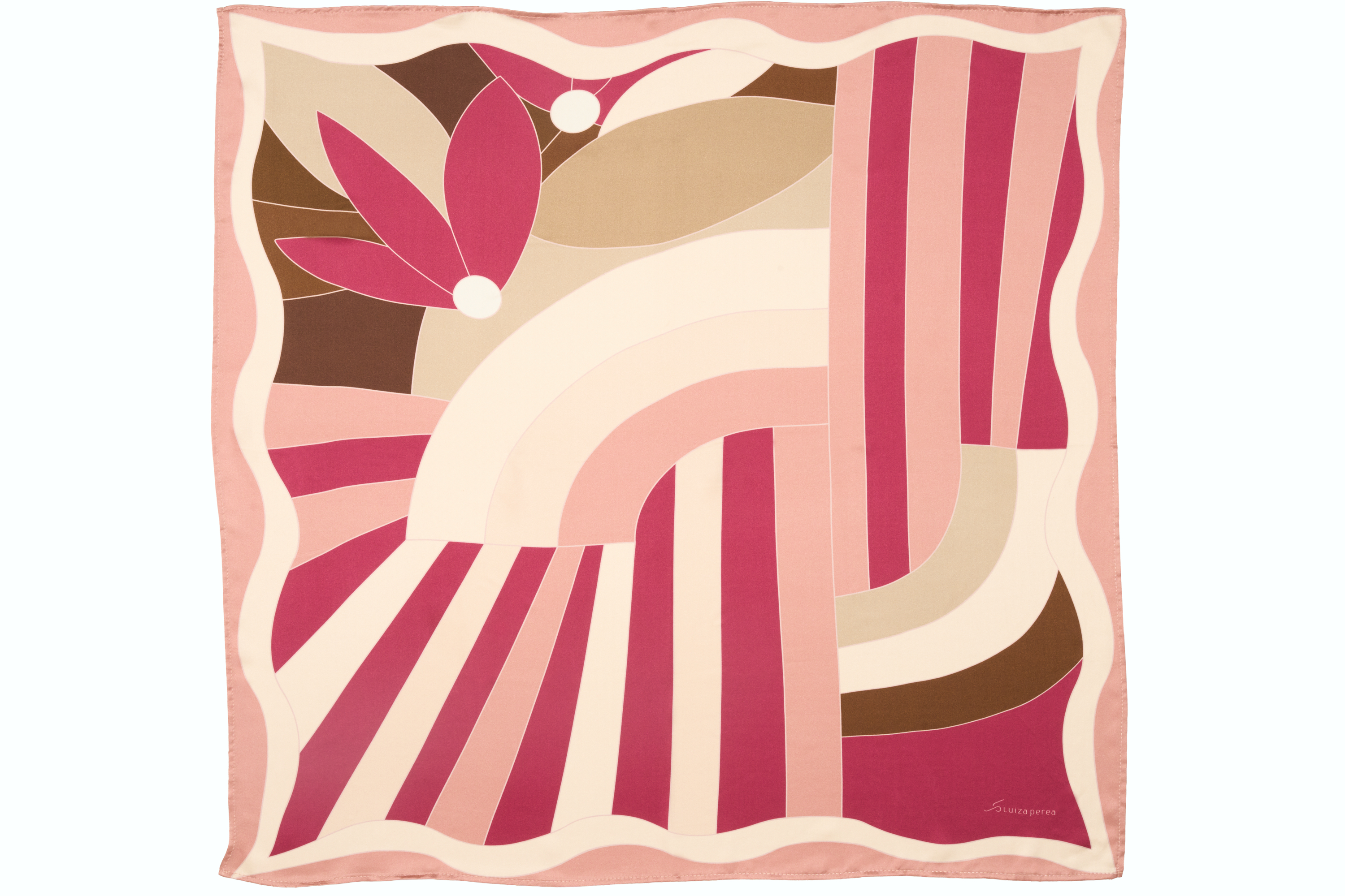 Lenço de seda acetinada — 86 × 84 cm de matéria que respira, desliza, existe de forma própria. A estampa é exclusiva da casa Luiza Perea, produzida em impressão digital de alta definição com a técnica Le Revers: um processo que leva a tinta ao avesso do tecido, tornando os dois lados perfeitamente estampados. Não há frente nem verso — apenas seda, de um lado ao outro. Para usar no pescoço, nos cabelos, no pulso, na bolsa. Ou simplesmente para ter.