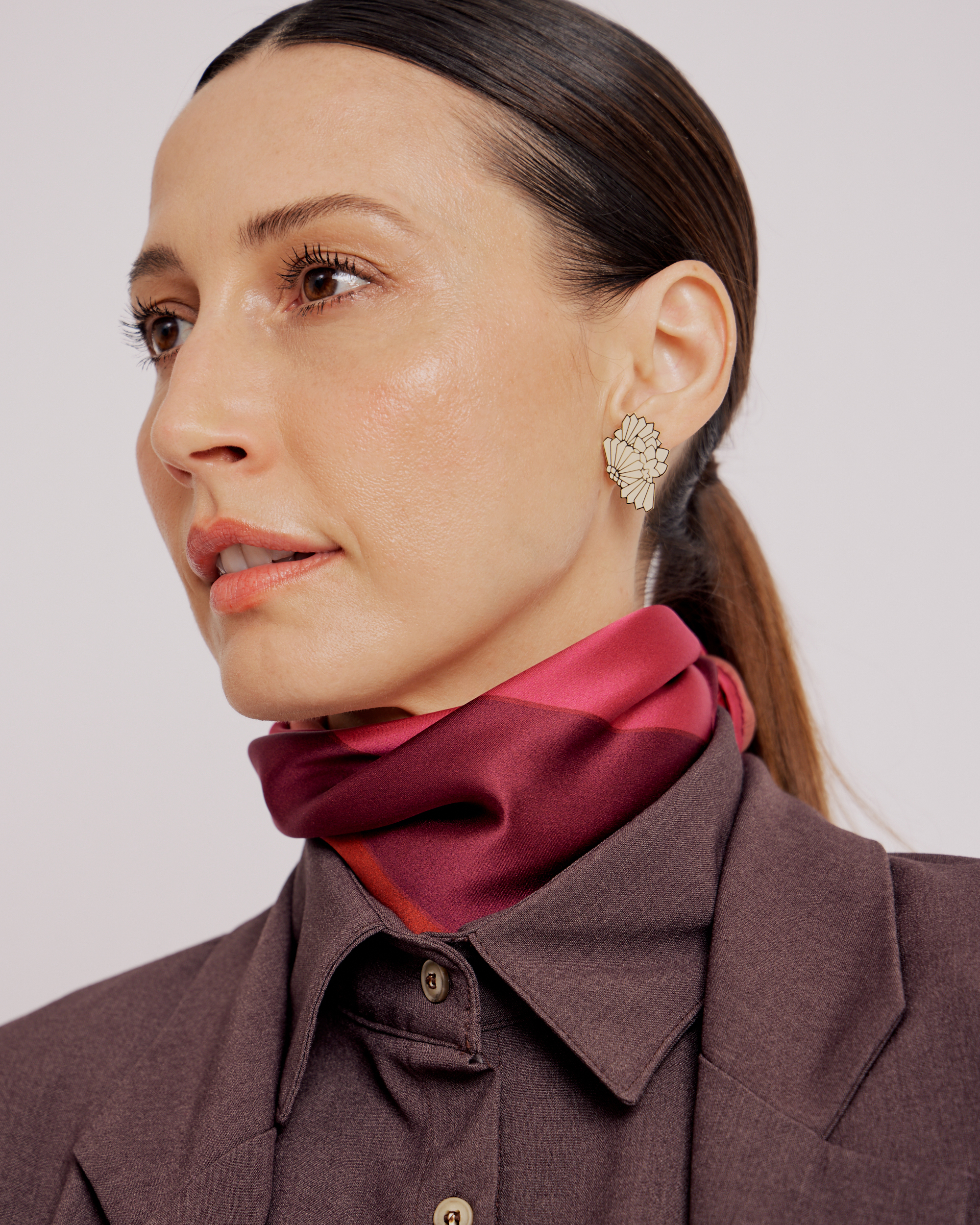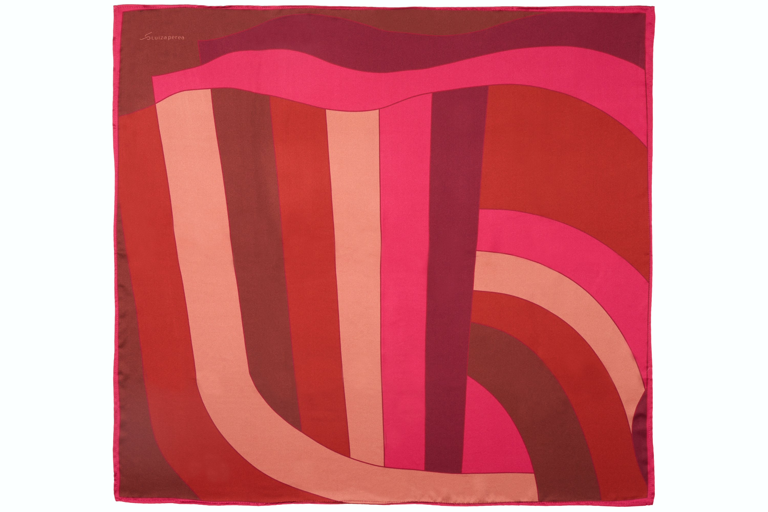 Lenço de seda acetinada — 86 × 84 cm de matéria que respira, desliza, existe de forma própria. A estampa é exclusiva da casa Luiza Perea, produzida em impressão digital de alta definição com a técnica Le Revers: um processo que leva a tinta ao avesso do tecido, tornando os dois lados perfeitamente estampados. Não há frente nem verso — apenas seda, de um lado ao outro. Para usar no pescoço, nos cabelos, no pulso, na bolsa. Ou simplesmente para ter.