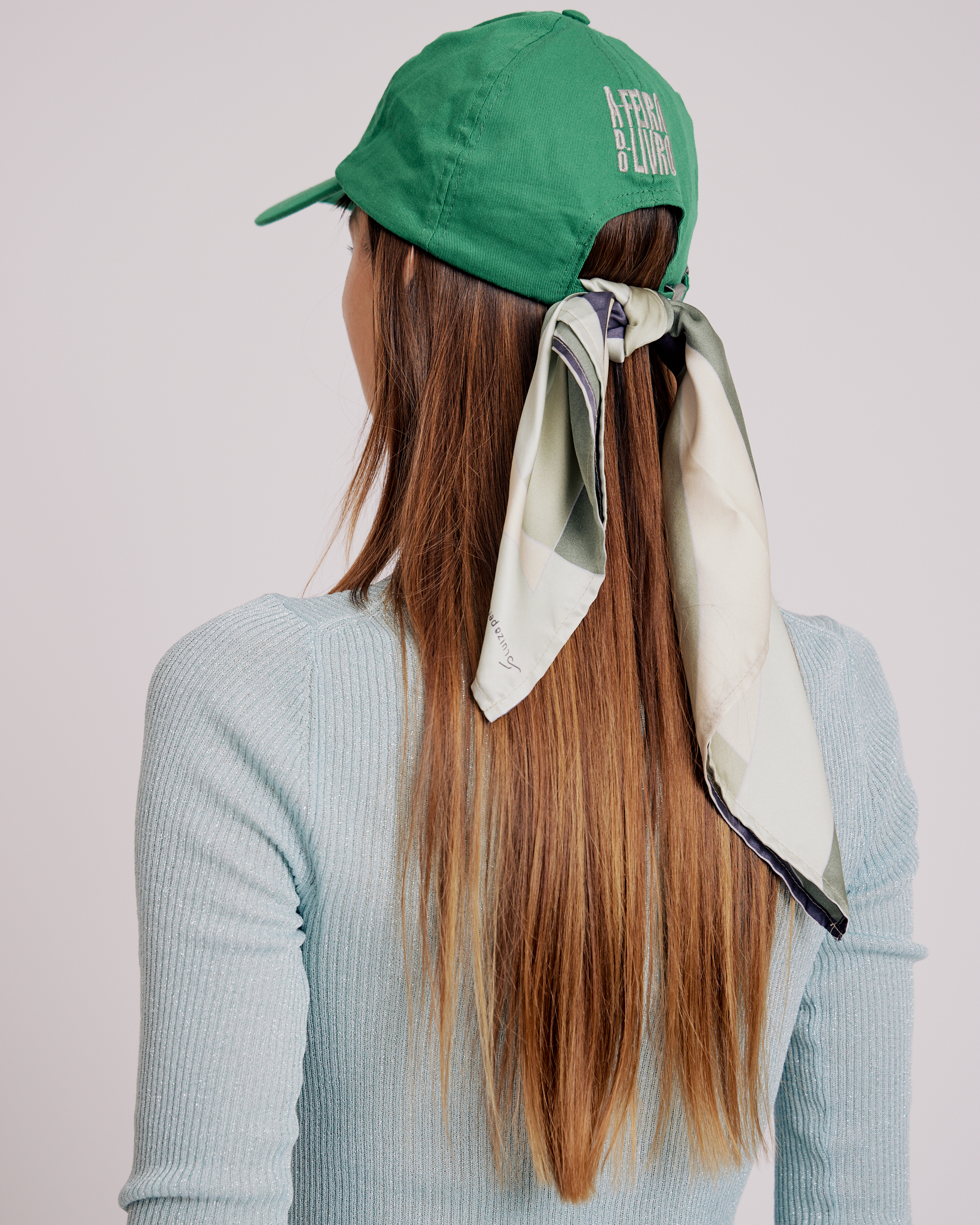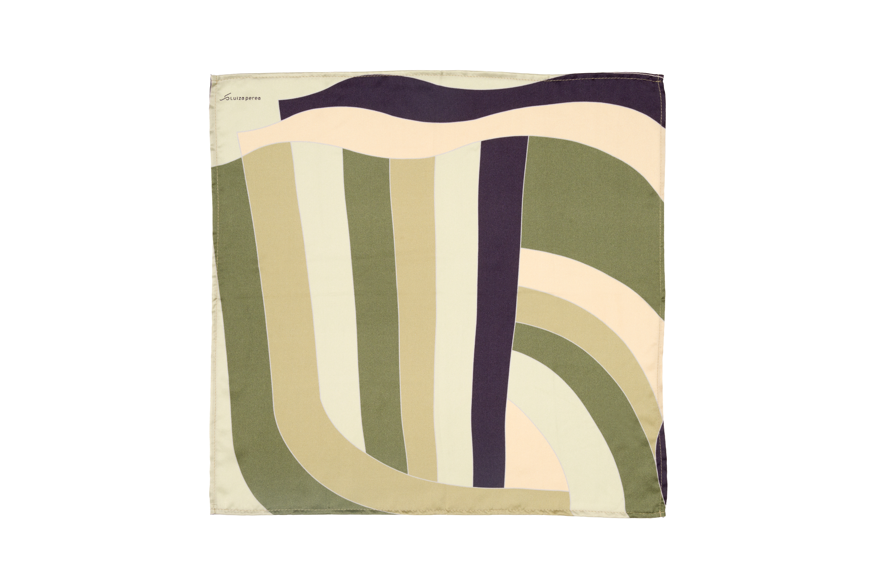 Lenço de seda acetinada — 45 × 45 cm de matéria que respira, desliza, existe de forma própria. A estampa é exclusiva da casa Luiza Perea, produzida em impressão digital de alta definição com a técnica Le Revers: um processo que leva a tinta ao avesso do tecido, tornando os dois lados perfeitamente estampados. Não há frente nem verso — apenas seda, de um lado ao outro. Para usar no pescoço, nos cabelos, no pulso, na bolsa. Ou simplesmente para ter.
