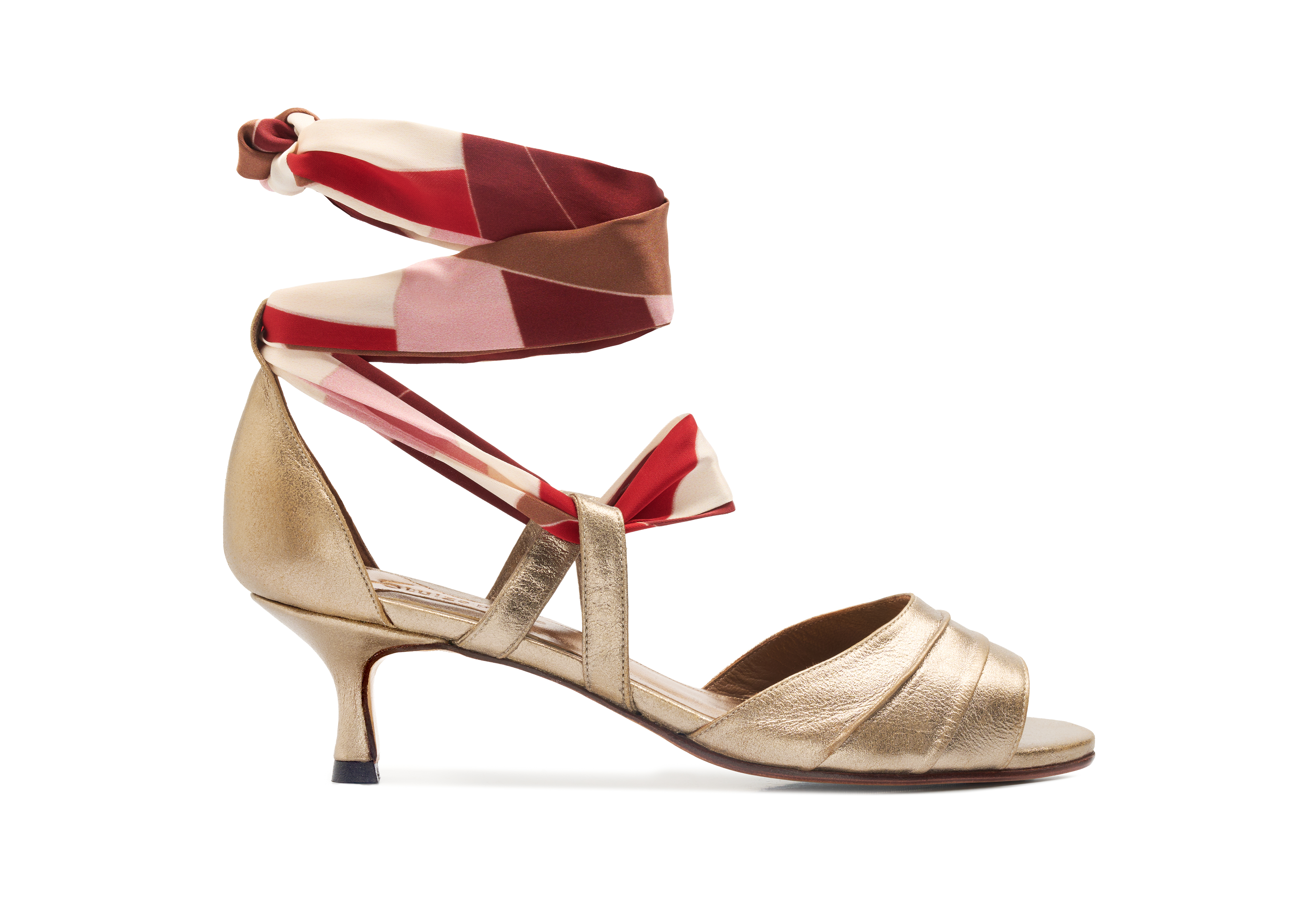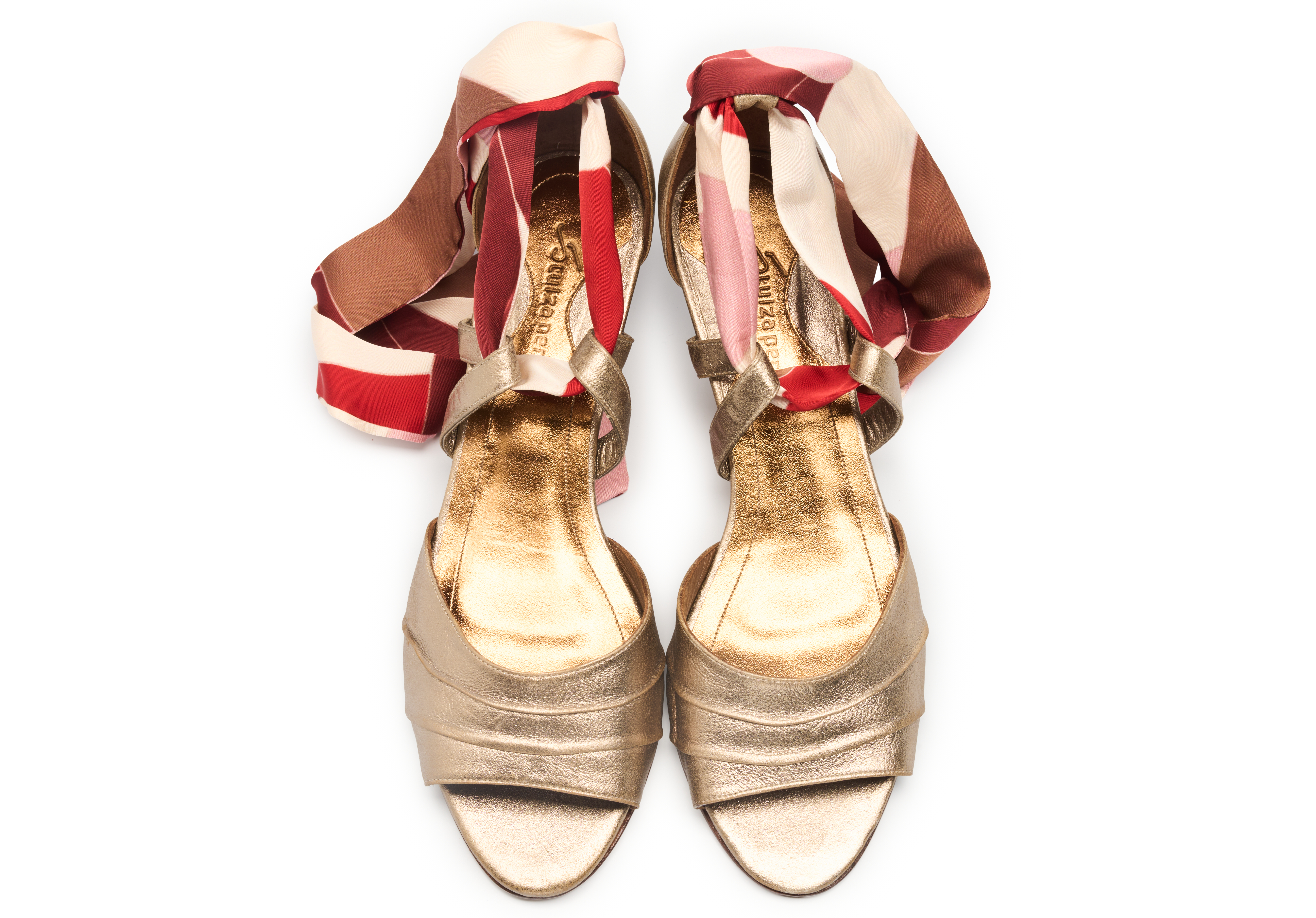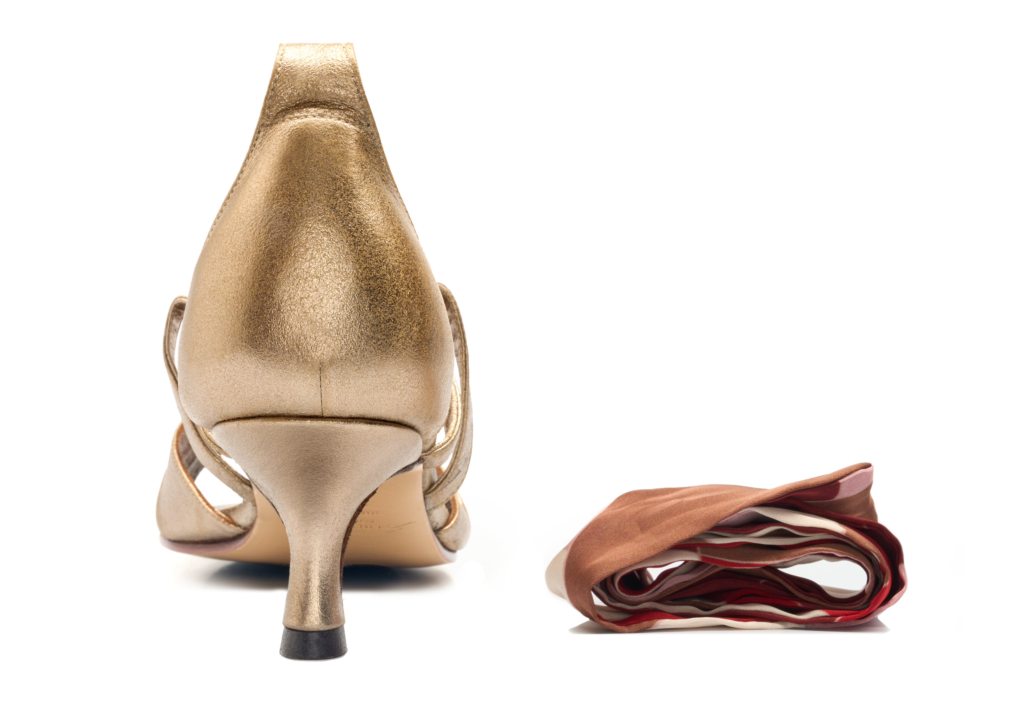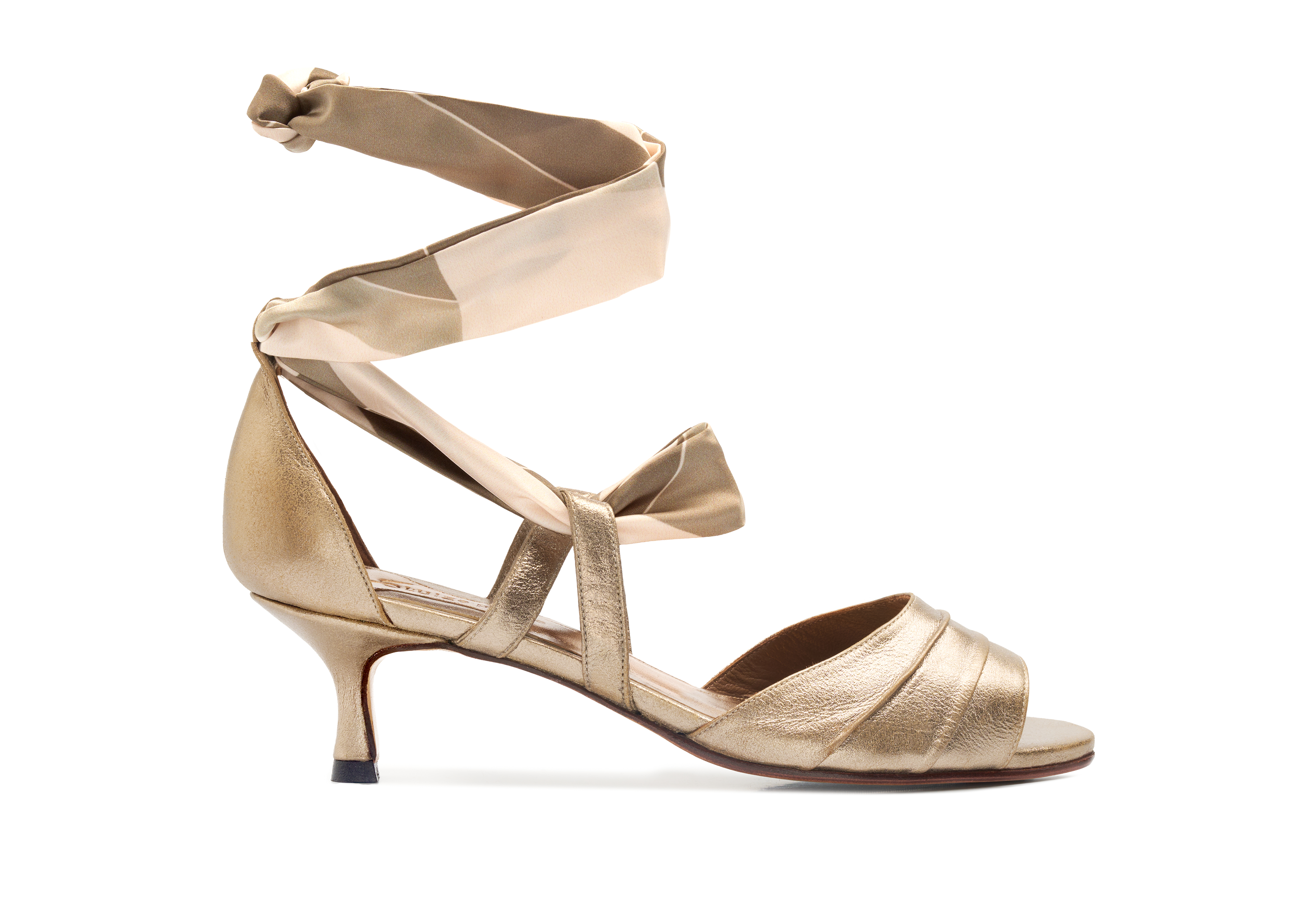 Produzido artesanalmente em couro de cabra tipo camurça metalizada no tom ouro branco || Salto fino 5cm || Calça fiel à numeração || Acompanha dois pares de faixas para amarração <3 ||