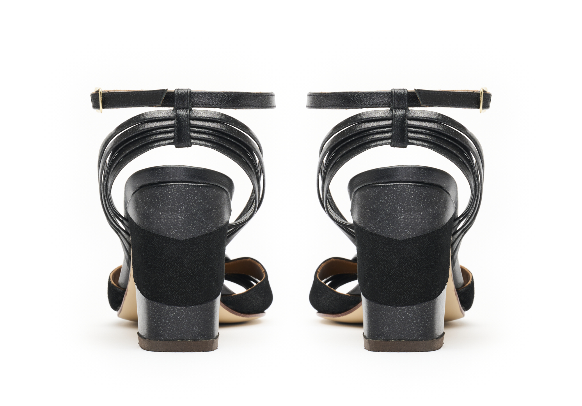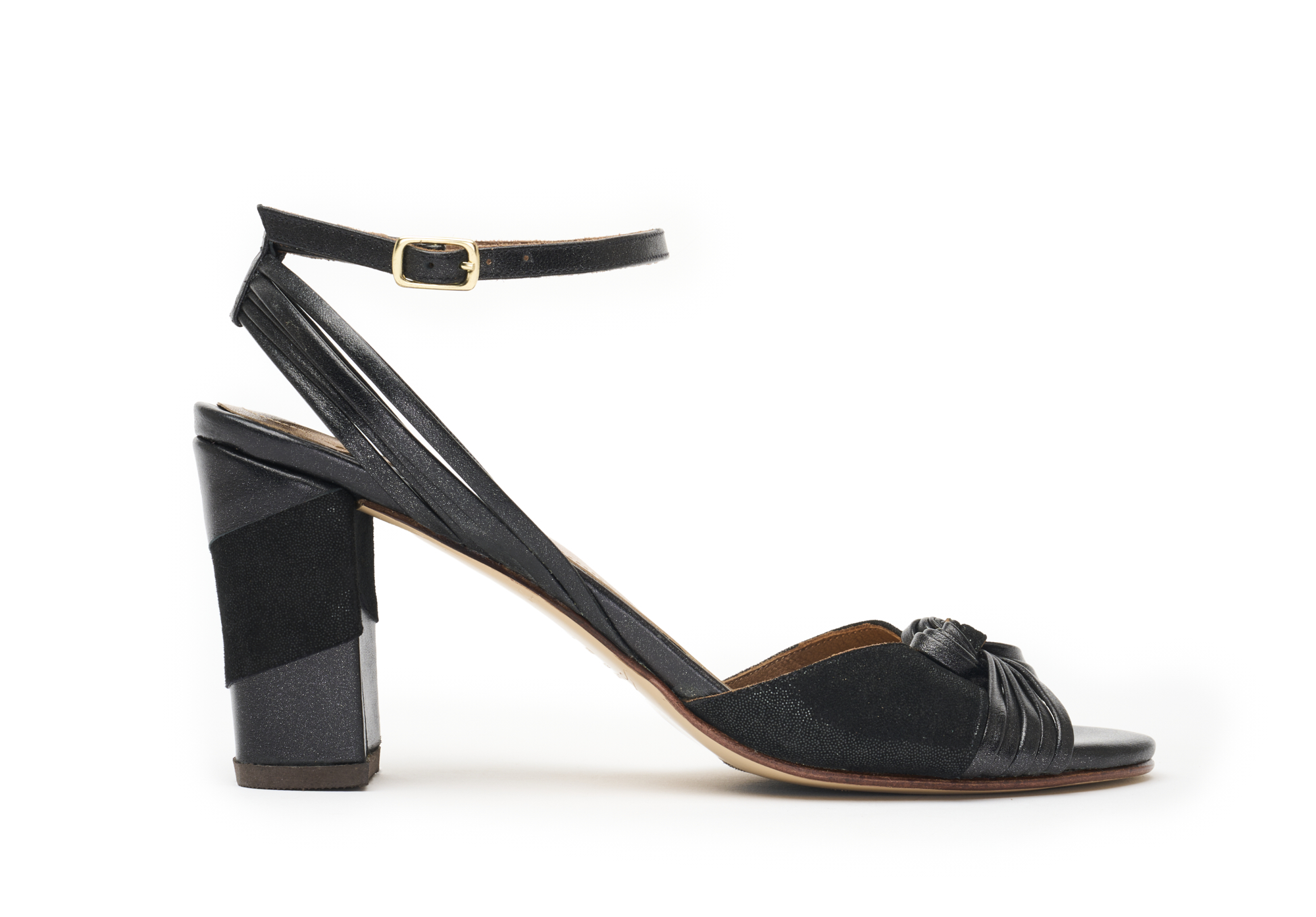 A sandália Íris é a união perfeita entre o design autoral e a sofisticação artesanal. Com salto de 8cm e ajuste por presilha no amarrio no tornozelo, esta peça explora a riqueza dos couros pretos, combinando acabamentos brilhantes e semi-brilhantes, resultado da união entre a camurça de cabra Paris e a camurça de cabra metálica. No salto, um elegante recorte em marchetaria adiciona um toque artístico, tornando cada par único e especial.